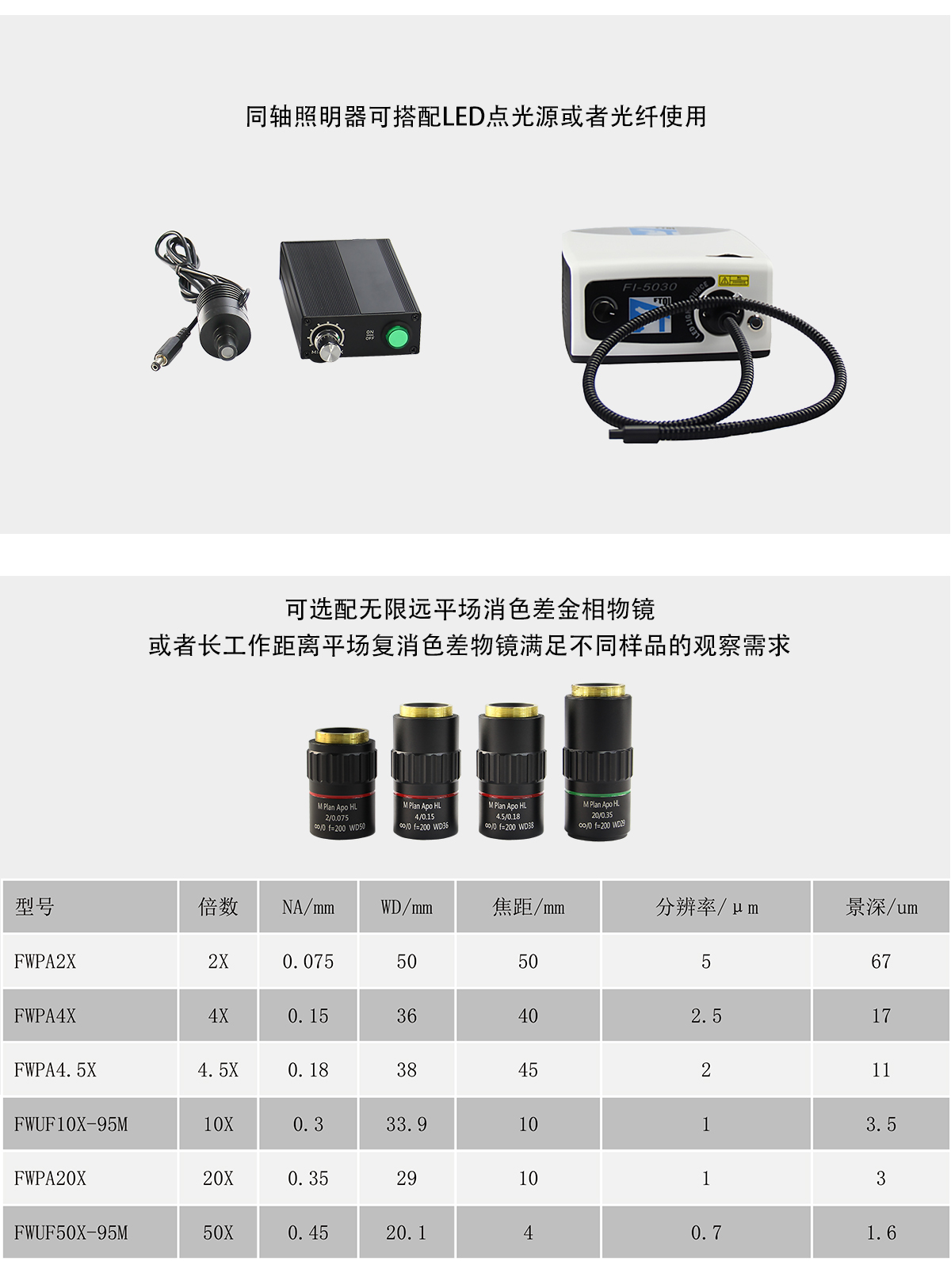1X定倍镜筒,标准C接口,可连接三孔或4孔物镜转换器,选配不同倍率的物镜使用,非同轴,同轴可选,可根据需要搭配LED光源或者光纤。