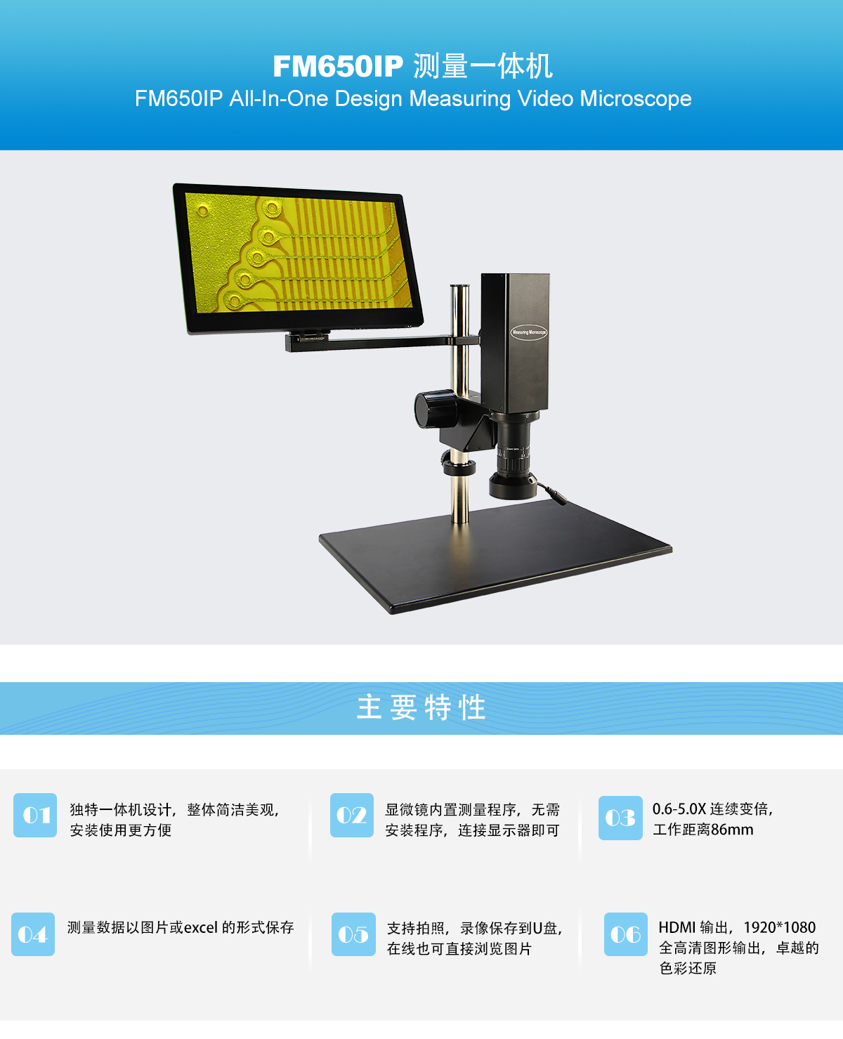 独特-体机设计,整体简洁美观,安装使用更方便。0.6-5.0X连续变倍,工作距离86mm,兼顾了测量和叠图的功能,简单易懂,调整数值多样化,测量数据以图片或excel 的形式保存;支持拍照,录像保存到U盘,在线也可直接浏览图片;1920*1080 全高清图形输出,卓越的色彩还原。