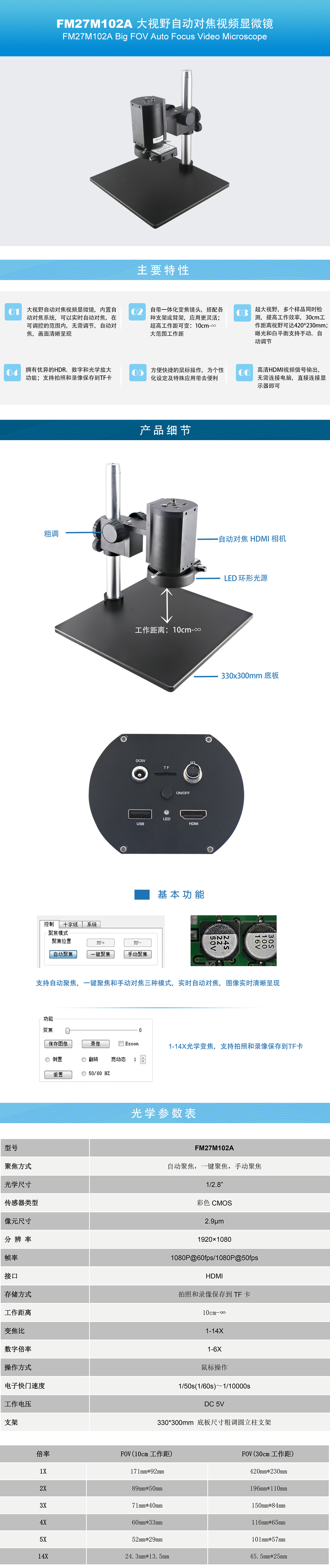 • FM27M102A大视野自动对焦视频显微镜,内置自动对焦系统,可以实时自动对焦,在可调控的范围内,无需调节,自动对焦,画面清晰呈现,30cm工作距离最大视野可达420mm