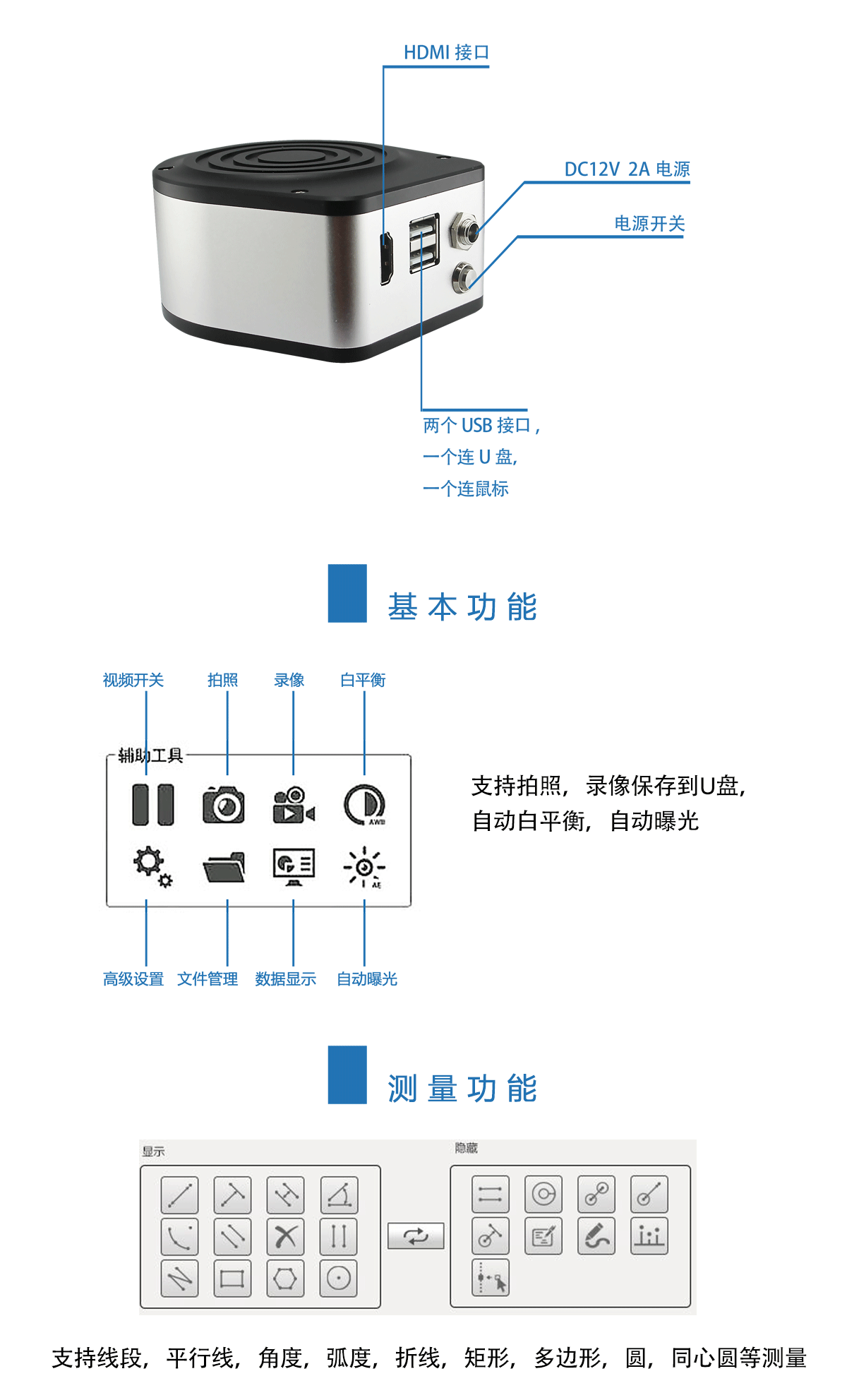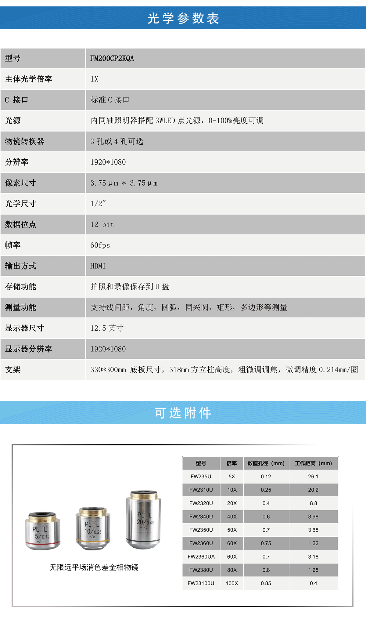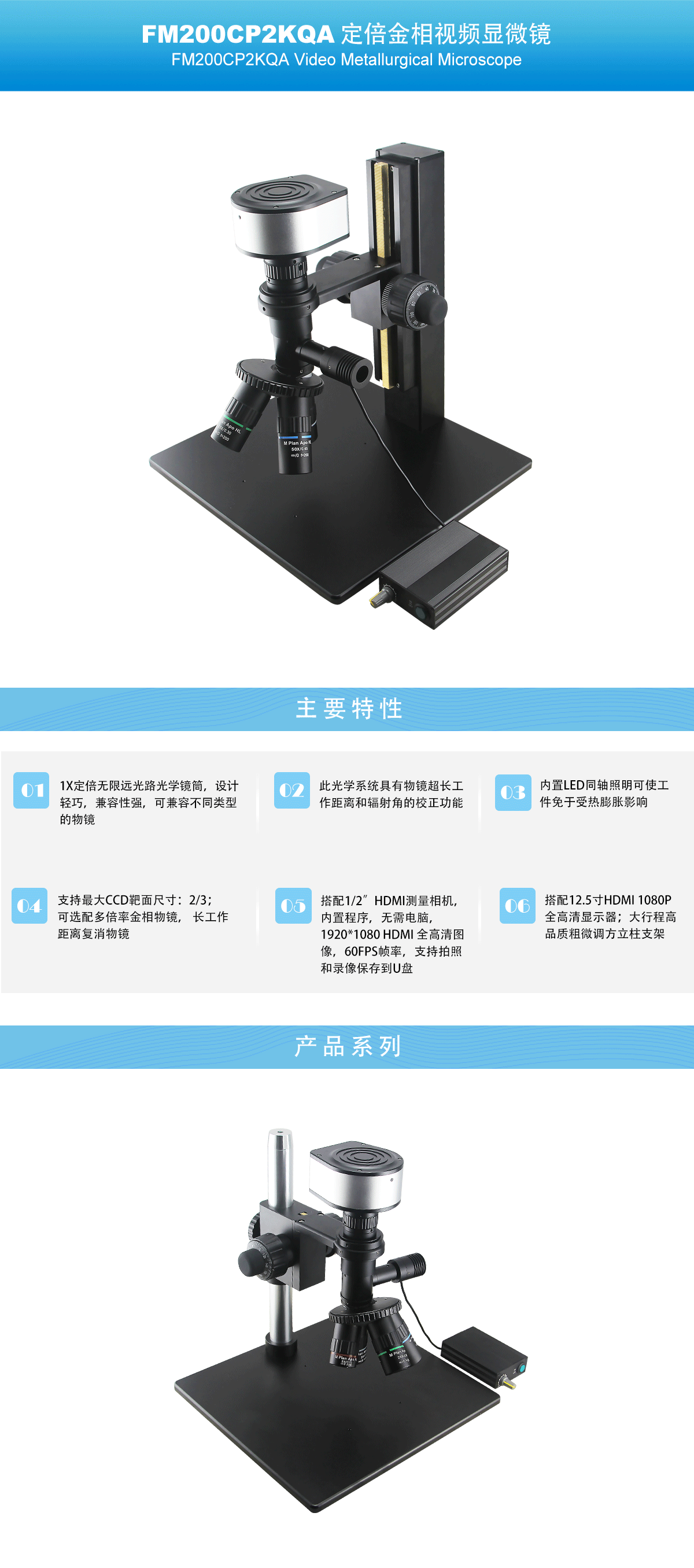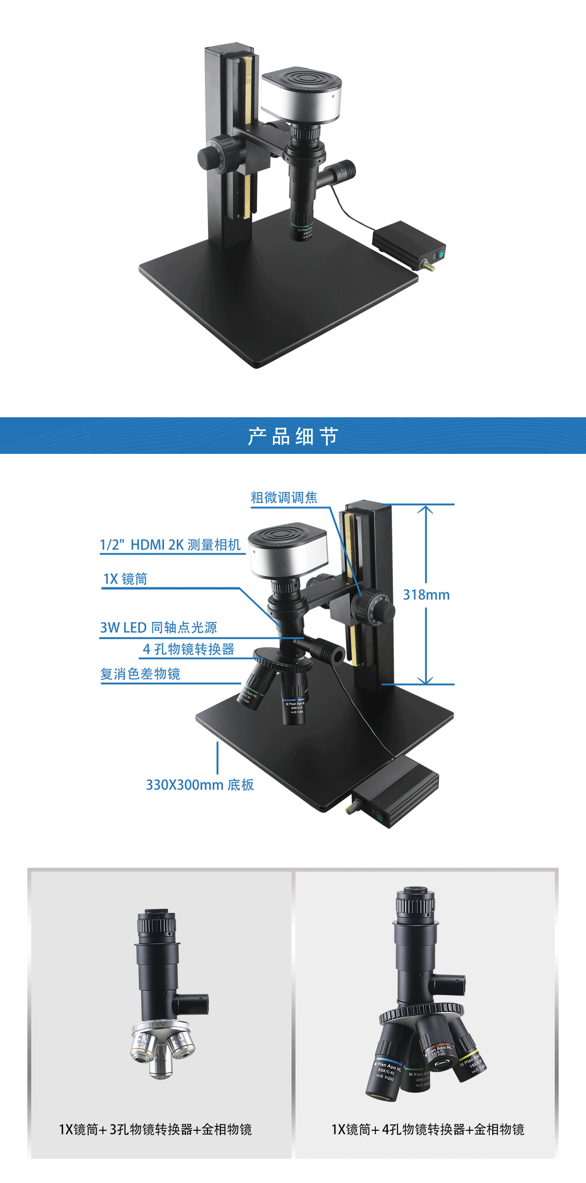 1X定倍无限远光路光学镜筒,设计轻巧,兼容性强,可兼容不同类型的物镜;搭配1/2”HDMI测量相机,内置程序,无需电脑,1920*1080 HDMI 全高清图像,60FPS帧率,支持拍照和录像保存到U盘;大行程精密粗微调方立柱支架;可广泛应用于纤维端面检查,液晶缺陷检查及校正,晶片缺陷检查及校正等方面。