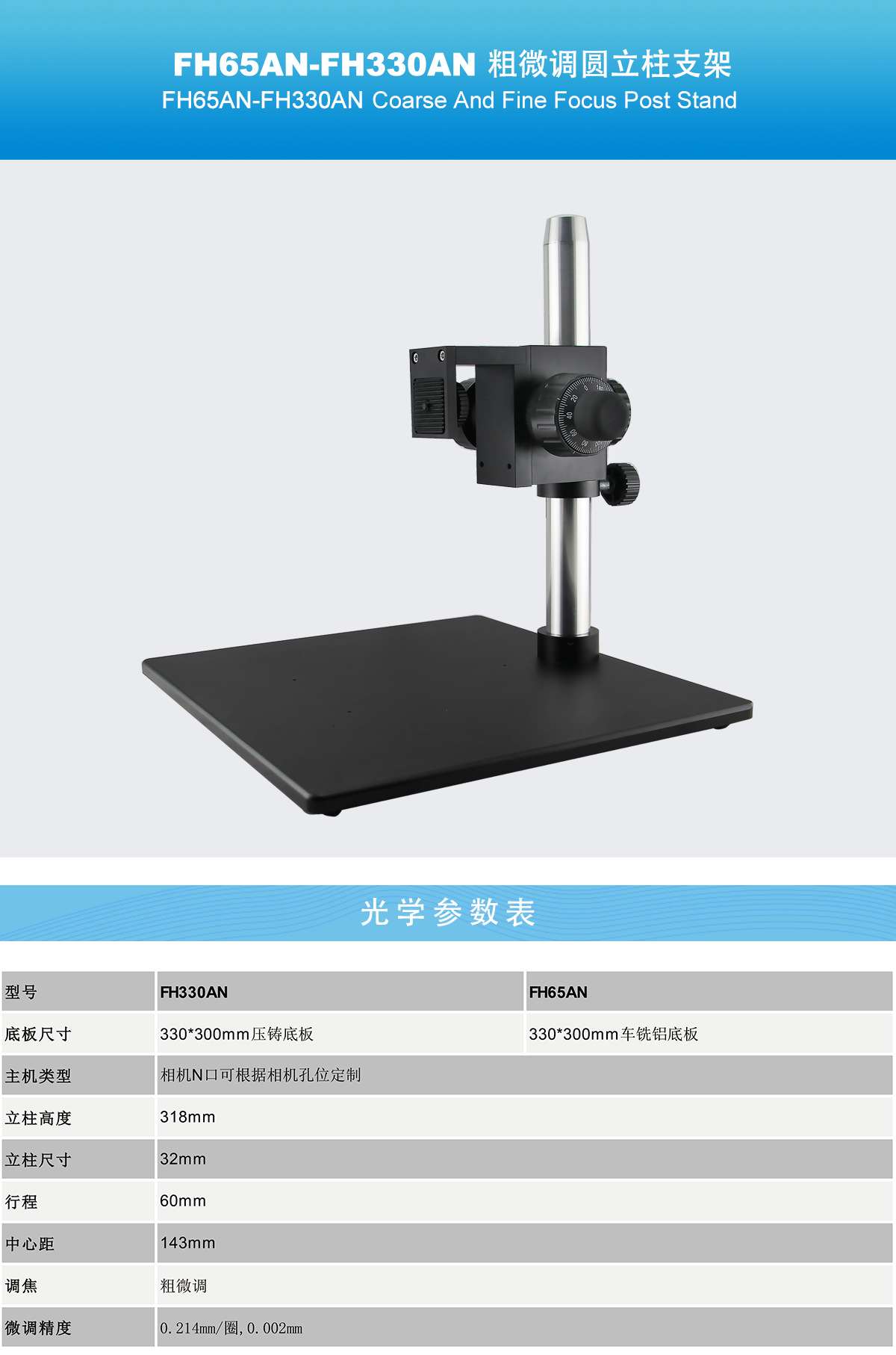 主机类型:相机N接口,立柱高度318mm,底板尺寸330*300mm,行程60mm,中心距143mm,微调精度0.214mm/圈,微调精度0.002mm。