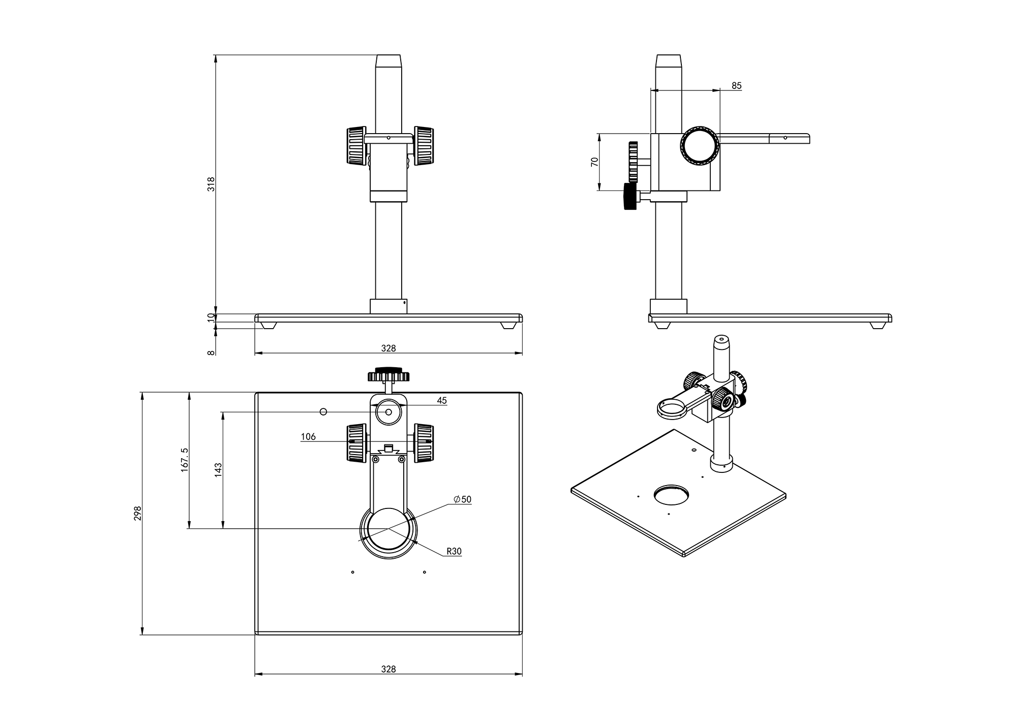 主机尺寸:50mm(可定制),立柱高度:318mm,立柱尺寸:32mm,底板尺寸:330*300mm,行程:50mm,中心距:143mm,带透射光源12V5W,0-100%亮度可调
