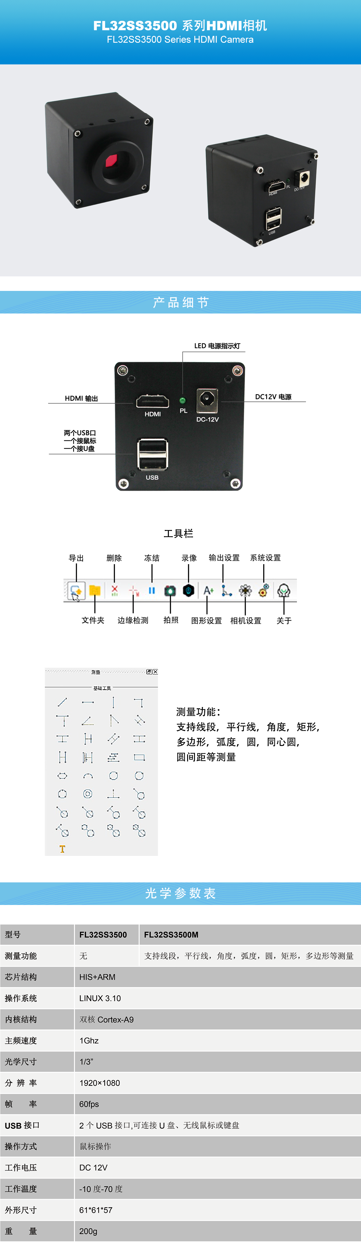 • FL32SS3500 HDMI系列摄像机是一款HDMI接口的200万像素的高速摄像机,分辨率1920*1080,图像可以达到每秒60帧画面。 本摄像机简化了操作流程,兼顾了测量和叠图的功能,简单易懂,调整数值多样化,可以观看多种情况下的物体。
