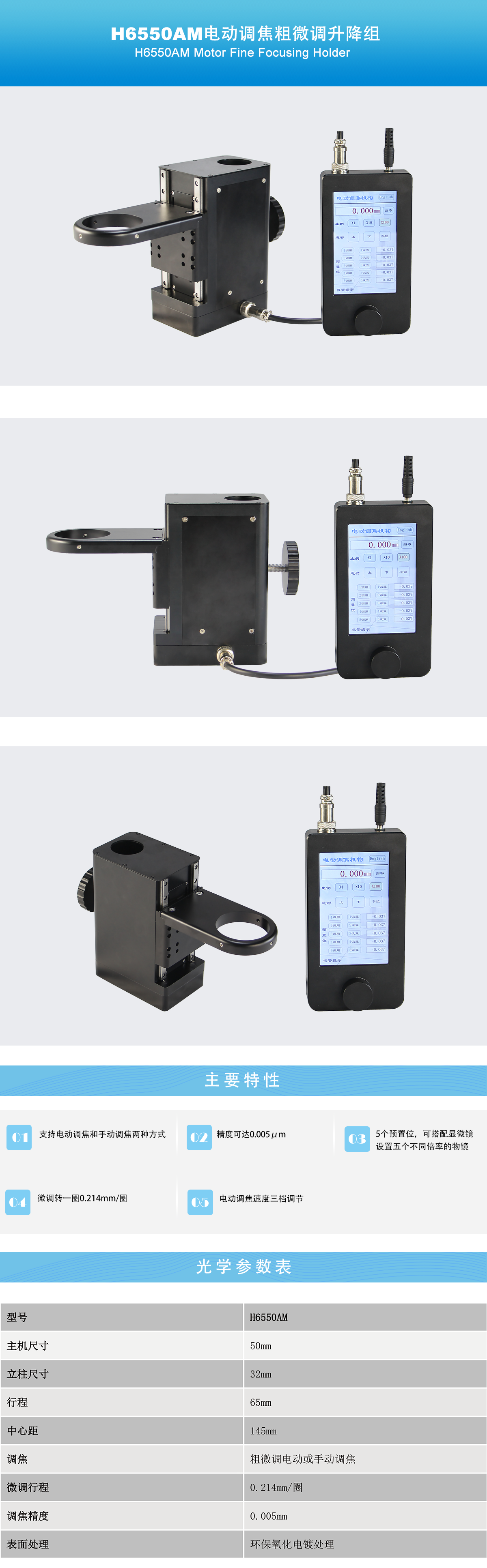 支持电动调焦和手动调焦两种方式,精度可达0.005mm,5个预置位,可搭配显微镜设置五个不同倍率的物镜,微调转一圈0.214mm/圈,电动调焦速度三档调节