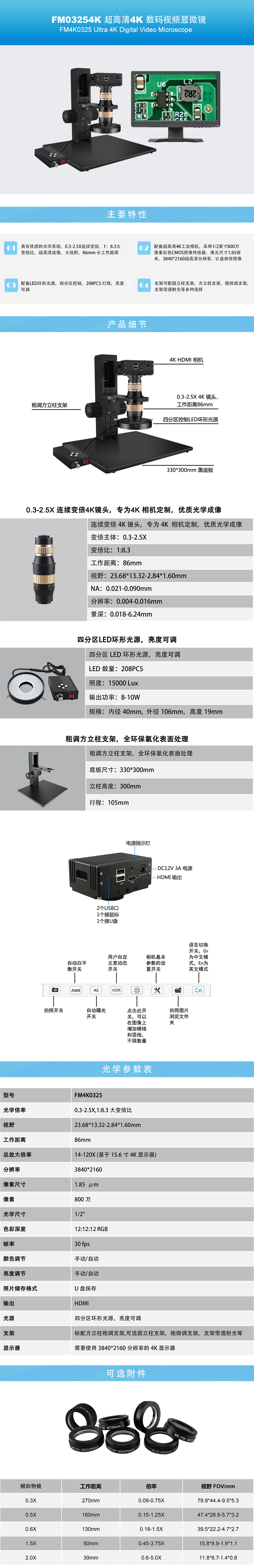 0.3-2.5X连续变倍,大视野,86mm 长工作距离。配备超高清4K工业相机,3840X2160超高清分辨率程序,采用1/2英寸800万像素彩色CMOS图像传感器,像元尺寸1.85微米,,U 盘保存图像。