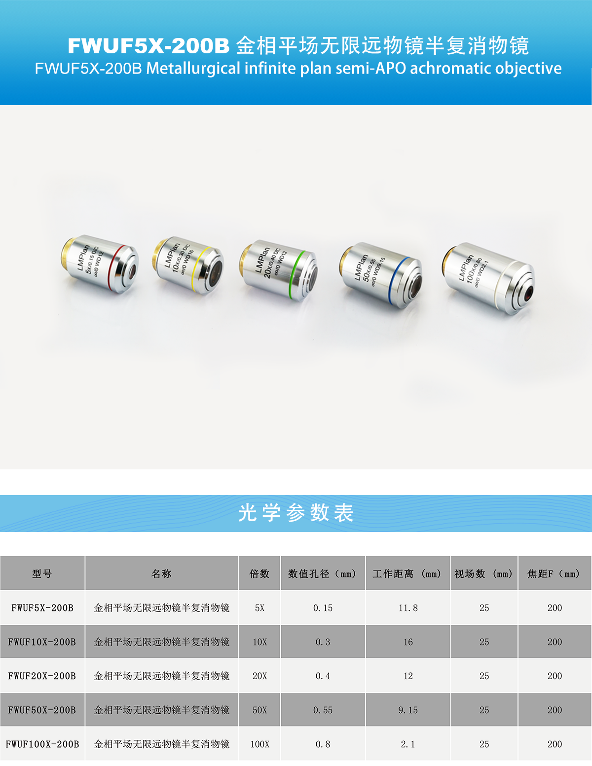 • FWUF5X-200B 金相平场无限远半复消物镜