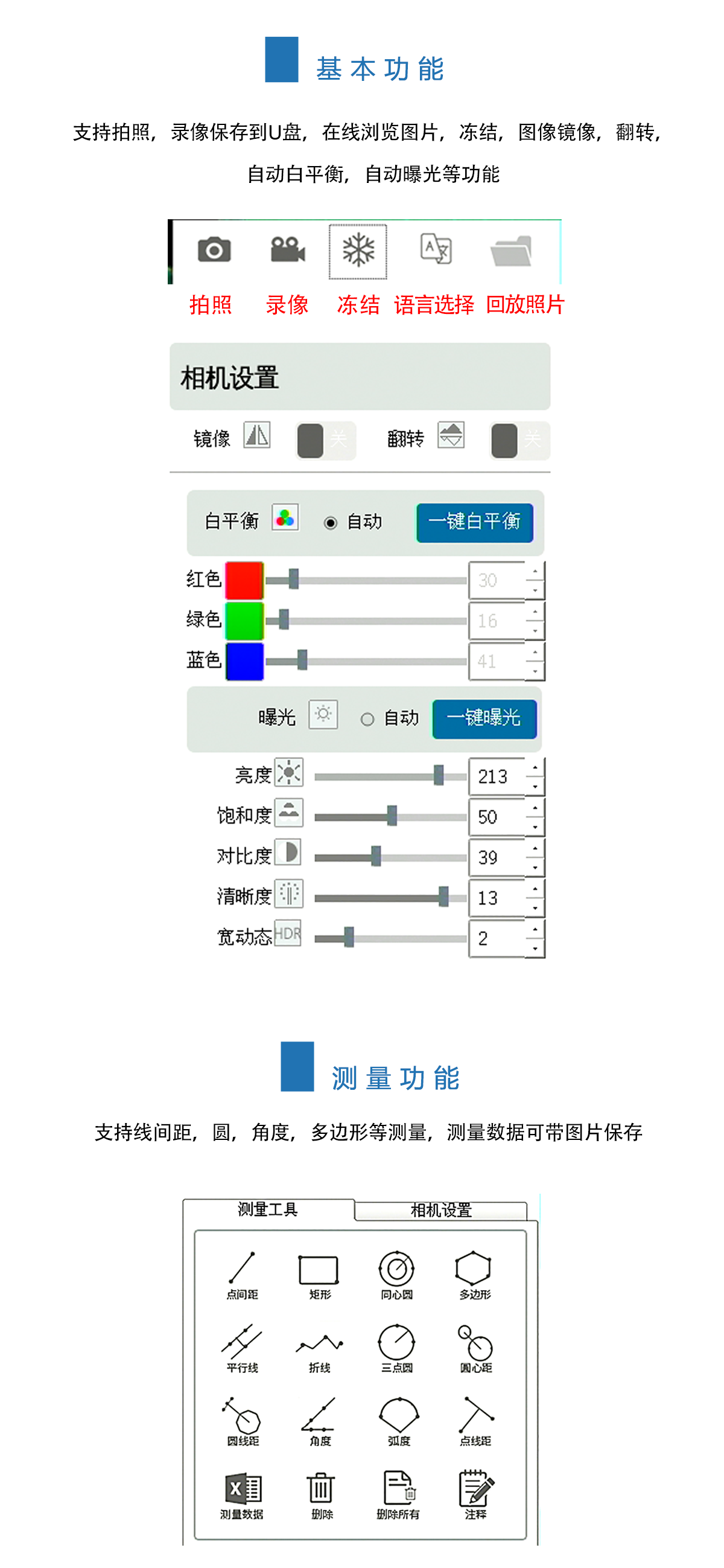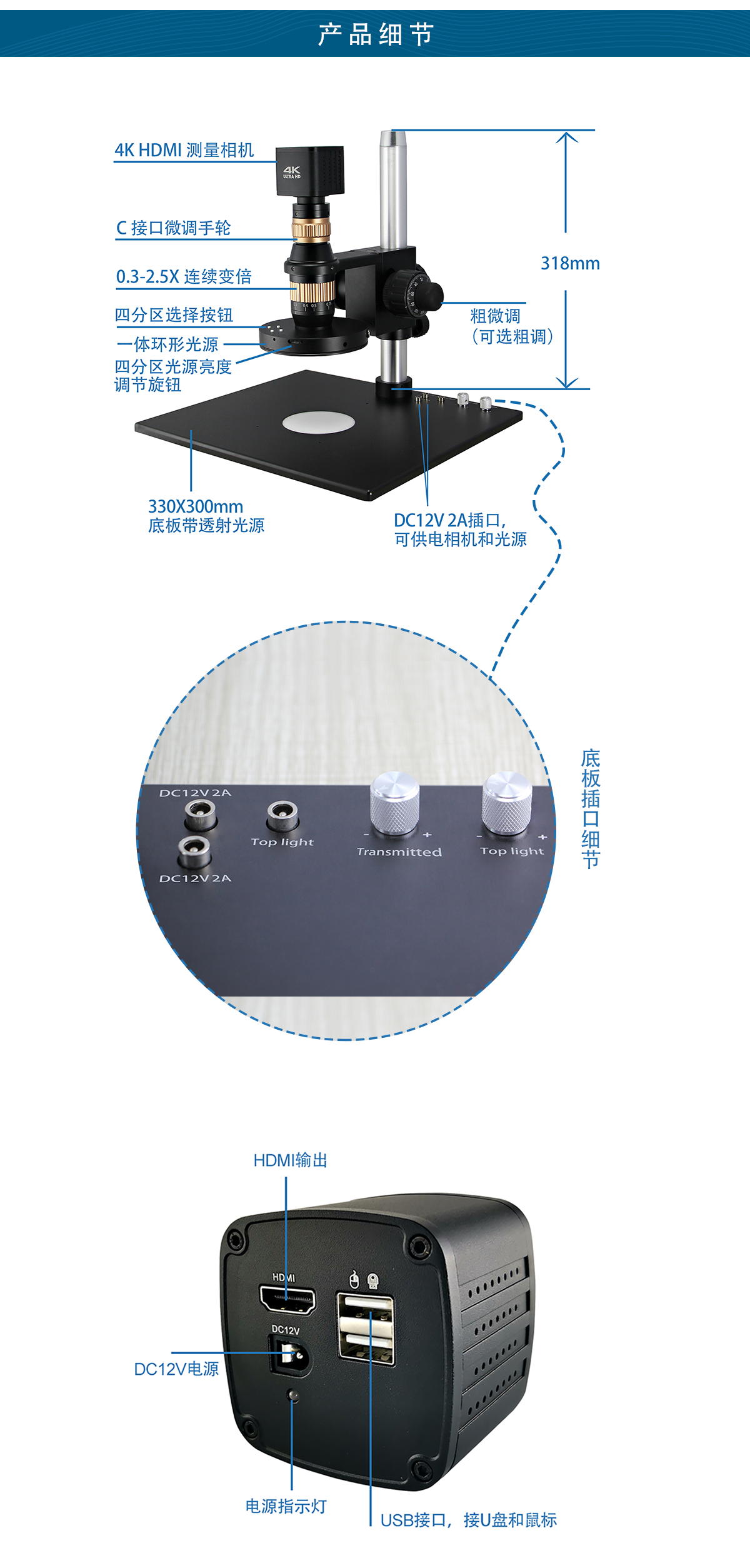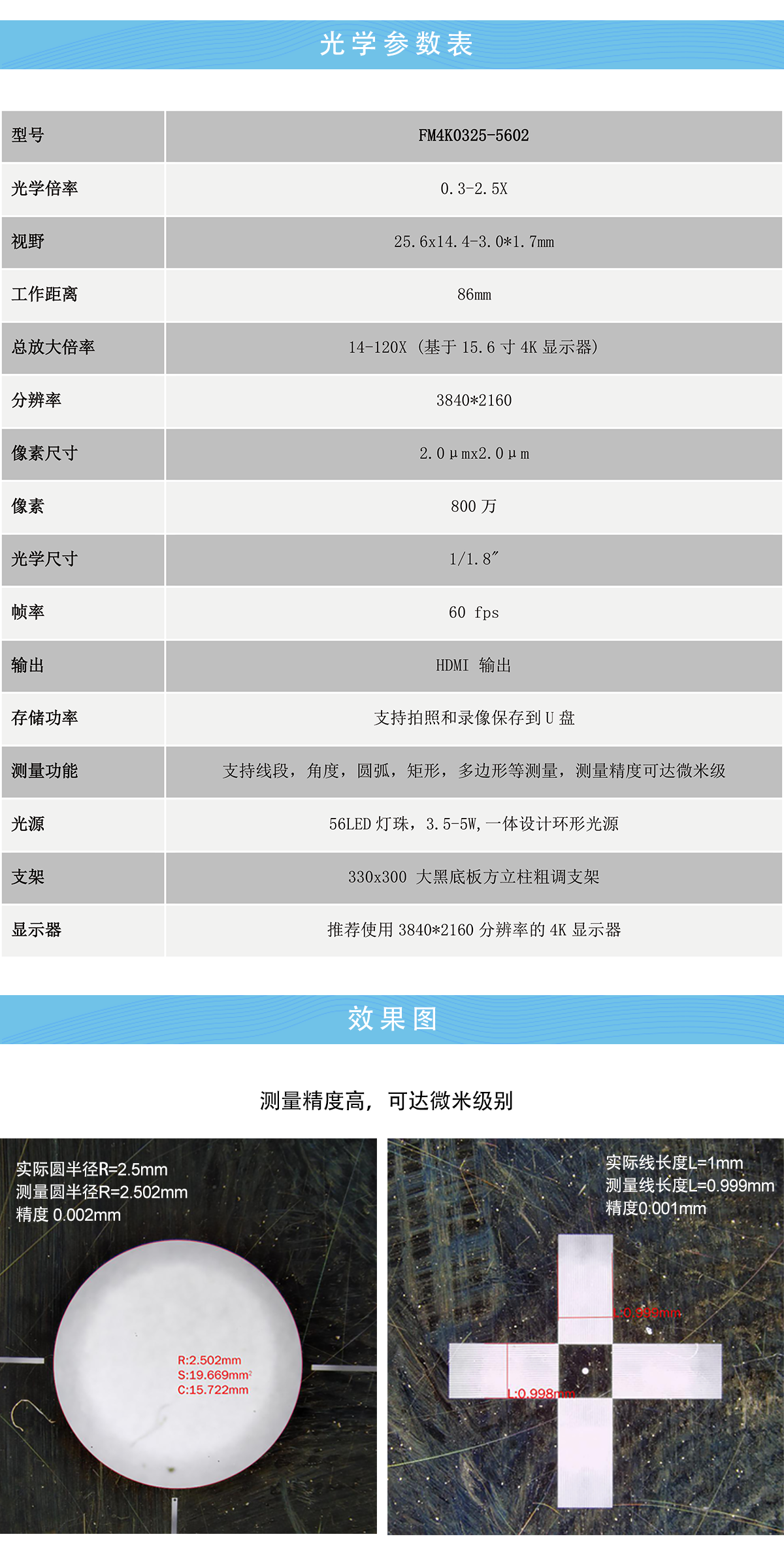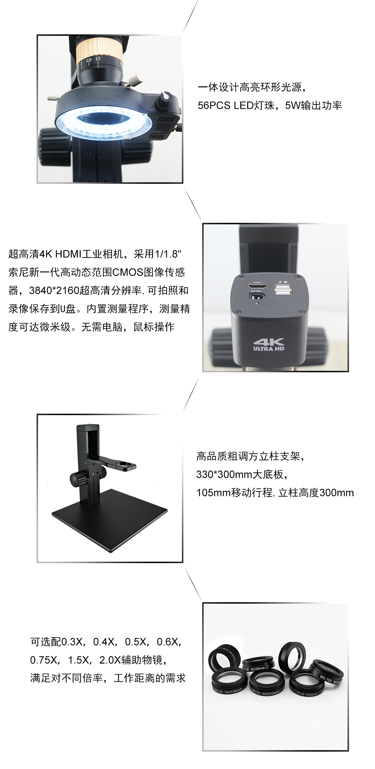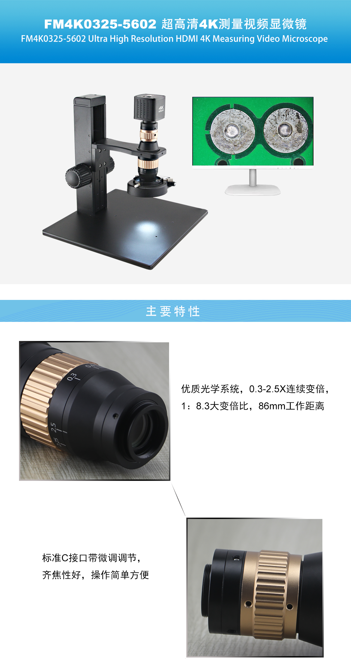 0.3-2.5X 连续变倍,3840*2160 超高清成像,HDMI 输出,可拍照和录像,内置测量软件,测量精度刻度微米级。