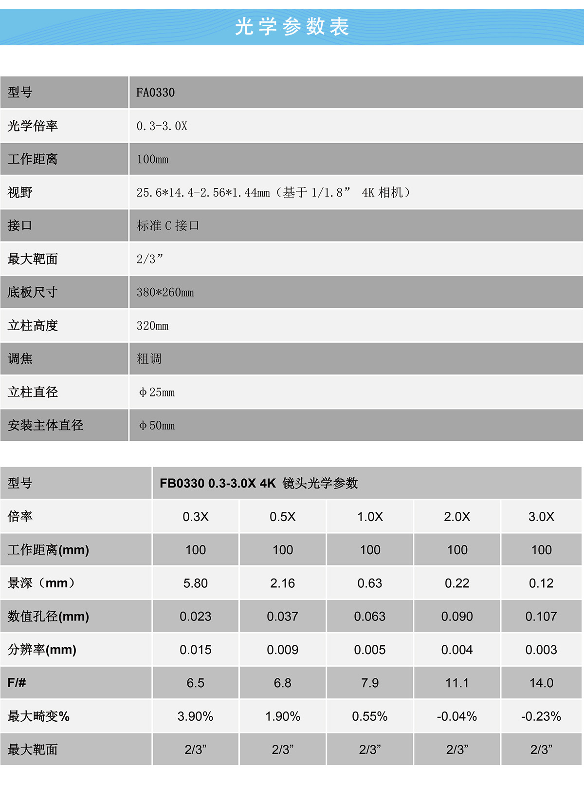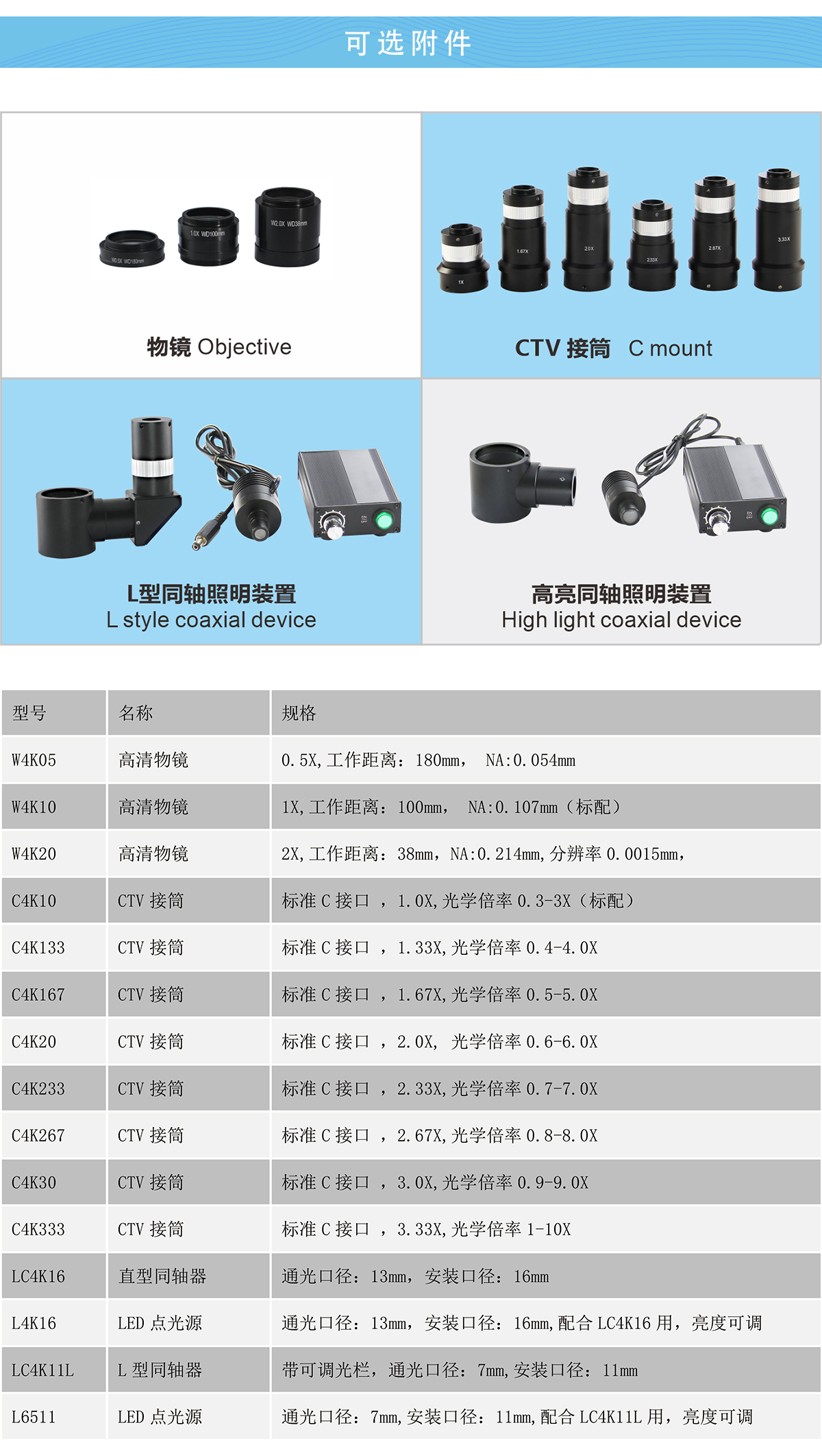 0.3-3.0X 连续变倍,10:1 超大变倍比,100mm 工作距离,标准C接口,可选配不同倍率CTV 接筒和物镜,复消色差光学系统,超高清4K成像。